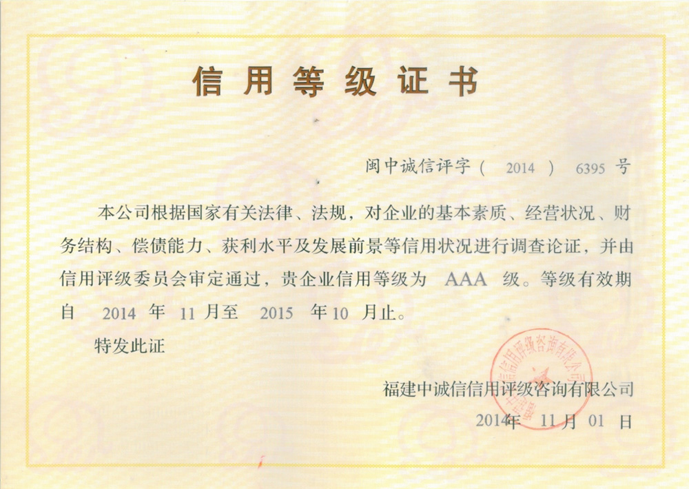 2014-2015 AAA信用等级证书(中诚信) 福建中诚信信用评级咨询有限公司 诚信企业 查看