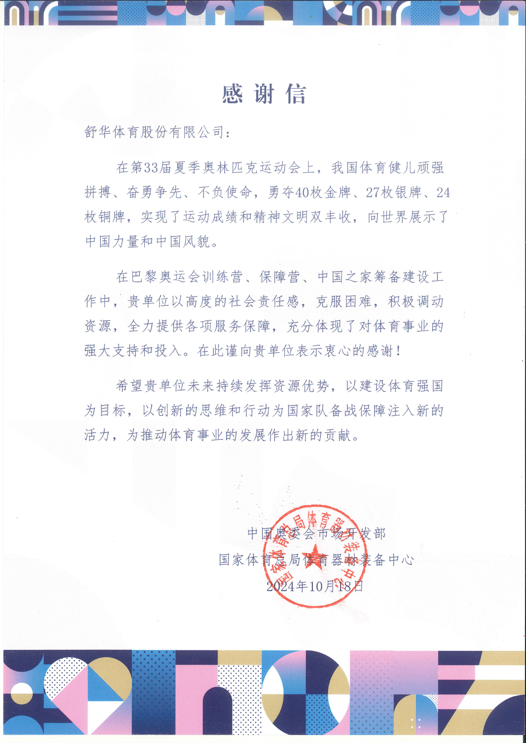 2024 巴黎奥运会感谢信 中国奥委会/国家体育总局 感谢信 查看